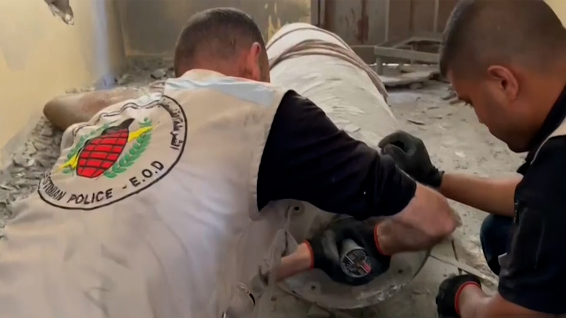 Dans une vidéo diffusée par Al Jazeera, les équipes de déminage sont vues en train de désamorcer une roquette de type « F-16 » tirée par l’armée israélienne sur une maison.