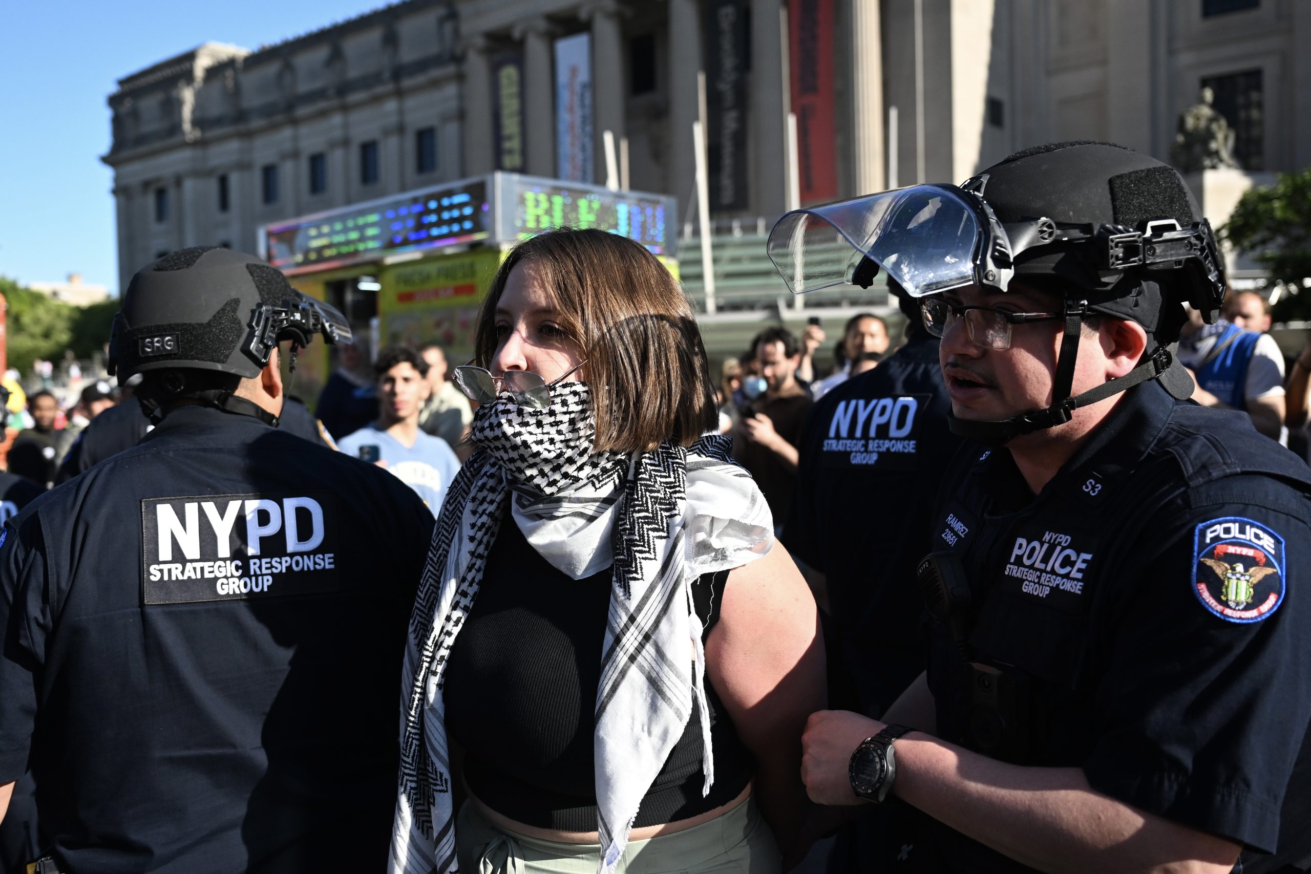 <p>Les manifestants ont pris le contrôle de certaines parties du Musée de Brooklyn à New York, accrochant une banderole au-dessus de l’entrée principale, occupant une grande partie du hall et se heurtant aux forces de l’ordre.</p>
