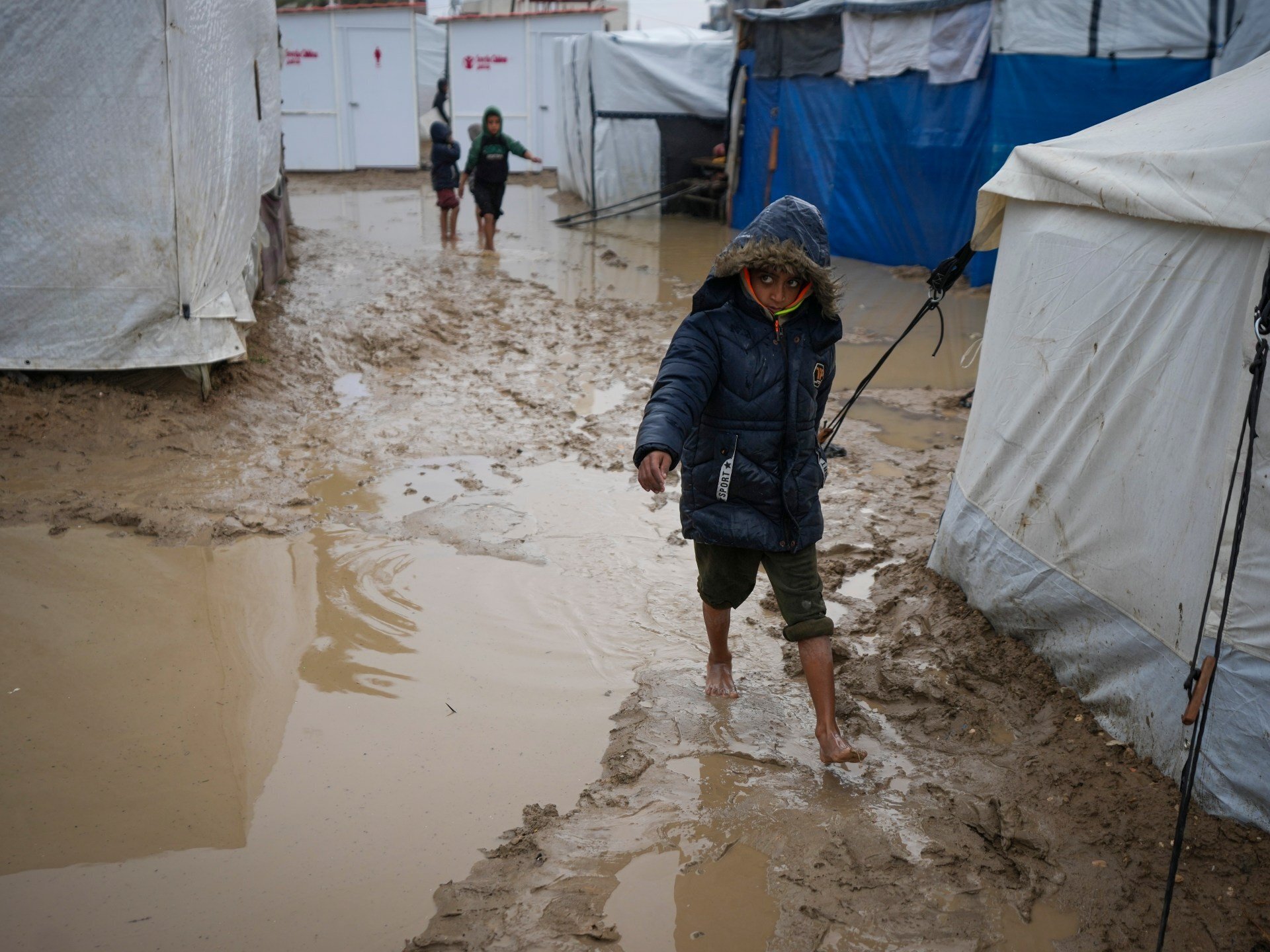 Des jours de fortes pluies ont inondé des centaines d’abris de fortune à travers l’enclave, aggravant la misère des Palestiniens contraints de fuir leur foyer alors qu’Israël continue de restreindre l’entrée de l’aide humanitaire. Au moins six nourrissons sont morts du froid ces derniers jours.