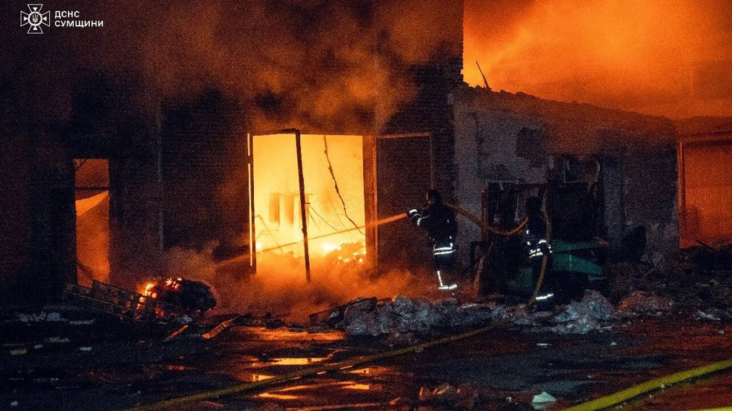 Des pompiers interviennent dans des incendies survenus suite aux attaques de drones russes ciblant des infrastructures civiles à Soumy, le 6 avril 2025. Ces événements soulignent l’intensification des hostilités dans la région.