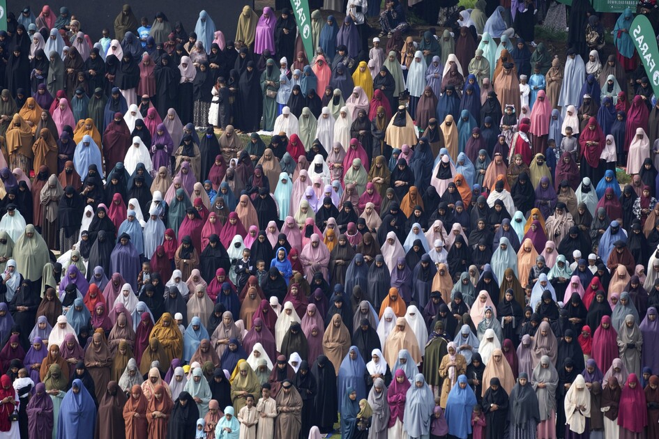 En Indonésie, la nation musulmane la plus peuplée du monde, les gens ont participé à des prières communautaires épaule contre épaule dans les rues et à l’intérieur des mosquées. La grande mosquée Istiqlal de Jakarta, la plus grande d’Asie du Sud-Est, était remplie de fidèles offrant des prières du matin.