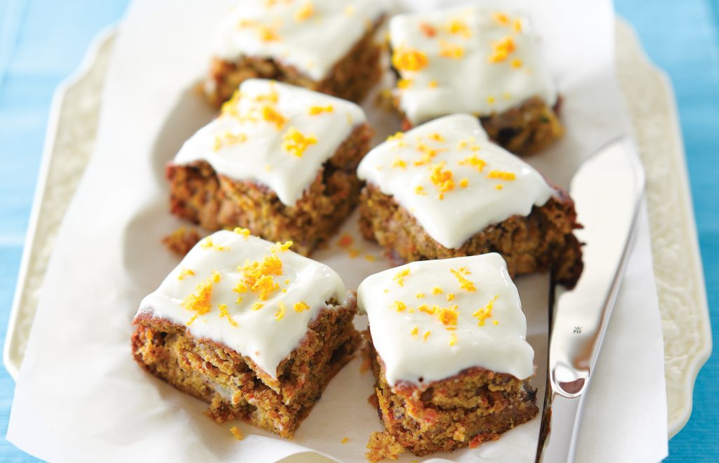 - Pour préparer le glaçage, mélangez le fromage, le sucre glace et le jus d’orange jusqu’à obtenir une consistance lisse. Étalez sur le gâteau refroidi et découpez en carrés.