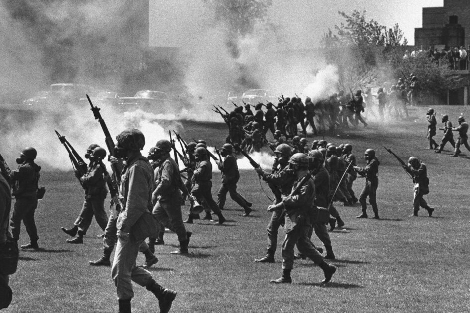 Pour réprimer ces manifestations, le maire de Kent, dans l’Ohio, a contacté le gouverneur de l’État, Jim Rhodes, pour lui demander de l’aide. Peu de temps après, un convoi de véhicules militaires transportant des centaines de membres de la Garde nationale est arrivé sur le campus. Le gouverneur, candidat républicain au Sénat américain aux primaires dans seulement 48 heures, a décidé d’utiliser une force excessive pour mettre fin aux manifestations étudiantes.