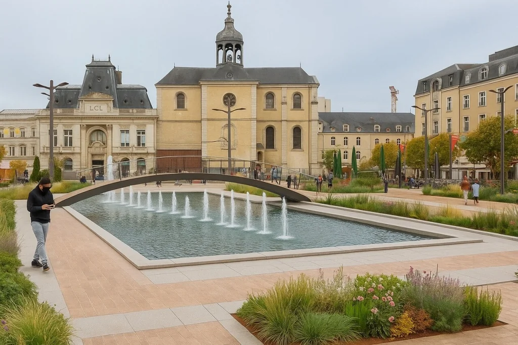 Plusieurs lieux emblématiques du Mans ont été peints par l’imaginaire généré par l’IA selon les instructions de Cyril. Parmi les destinations revisitées, la place de la République est présentée avec sa fontaine intégrée à une vision artificielle, et le patrimoine des Jacobins, le tunnel et l’église de la Couture apparaissent sous un éclairage réinventé.