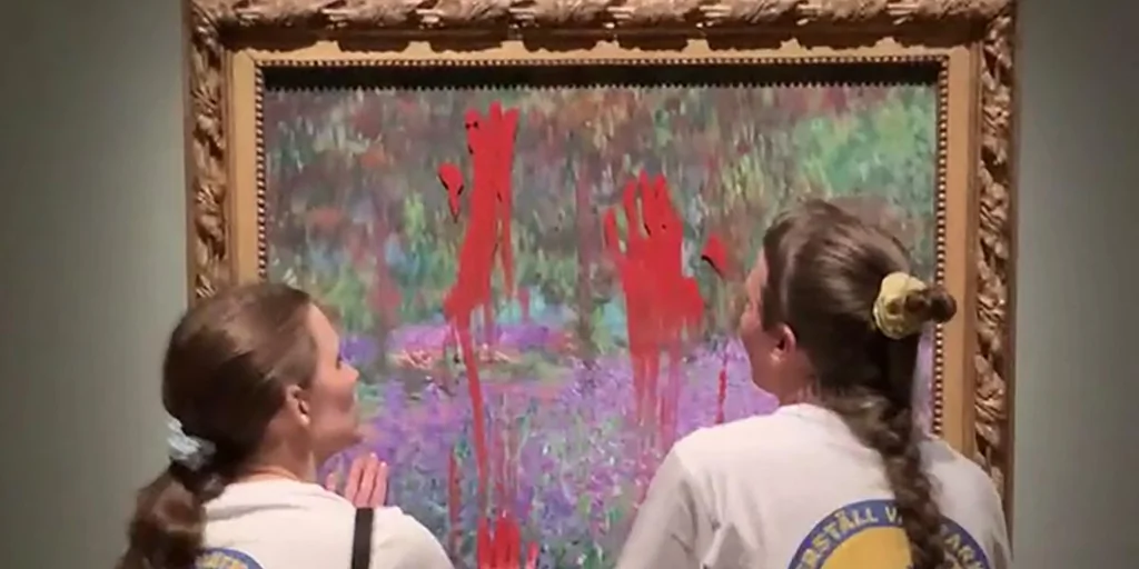 Le geste consistait à asperger la vitre protégeant le Monet avec de la peinture rouge; les défenseurs affirment que l’objectif était d’interpeller sur l’urgence climatique et non d’endommager l’œuvre. Dans une vidéo revendiquée par l’organisation Återställ Våtmarker, on entendait les slogans « la situation climatique est urgente » et « notre santé est menacée ». L’œuvre concernée, Le Jardin de l’artiste à Giverny (1900), était prête par le musée d’Orsay au Nationalmuseum dans le cadre de l’exposition consacrée aux jardins et à la nature.