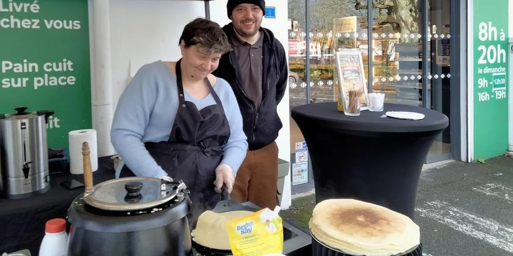 À Navarrenx, des crêpes gratuites pour la Chandeleur ont été offertes par Aurore et Olivier de Maison K Traiteur Évent devant le supermarché.