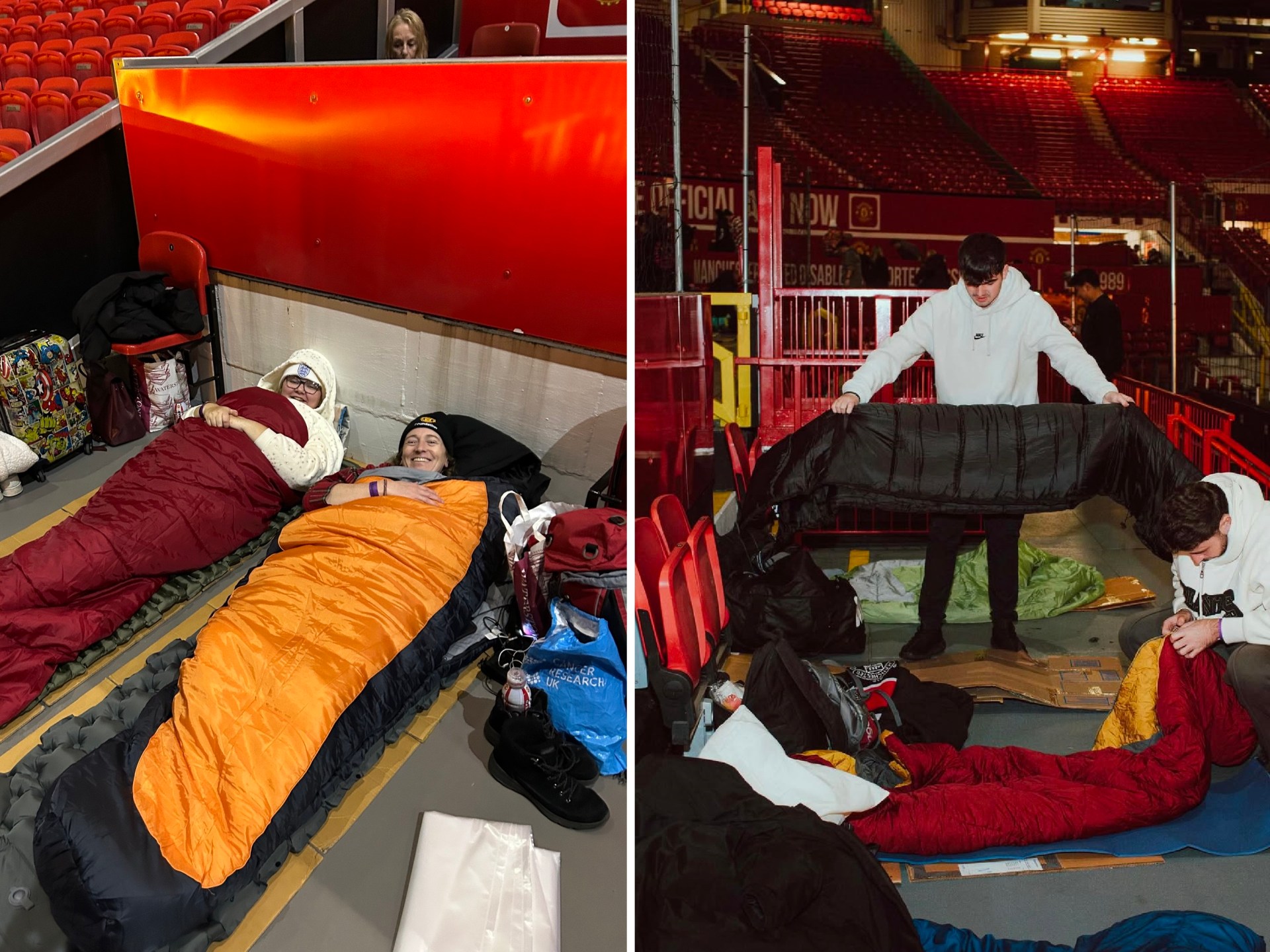 Des images et une vidéo ont circulé massivement sur les réseaux sociaux montrant des dizaines de personnes enveloppées dans des sacs de couchage, installées sur les gradins d’Old Trafford. Les publications affirmaient que Manchester United avait « ouvert les portes » du stade pour héberger des sans‑abris afin qu’ils ne dorment pas dans la rue sous la pluie et le froid.