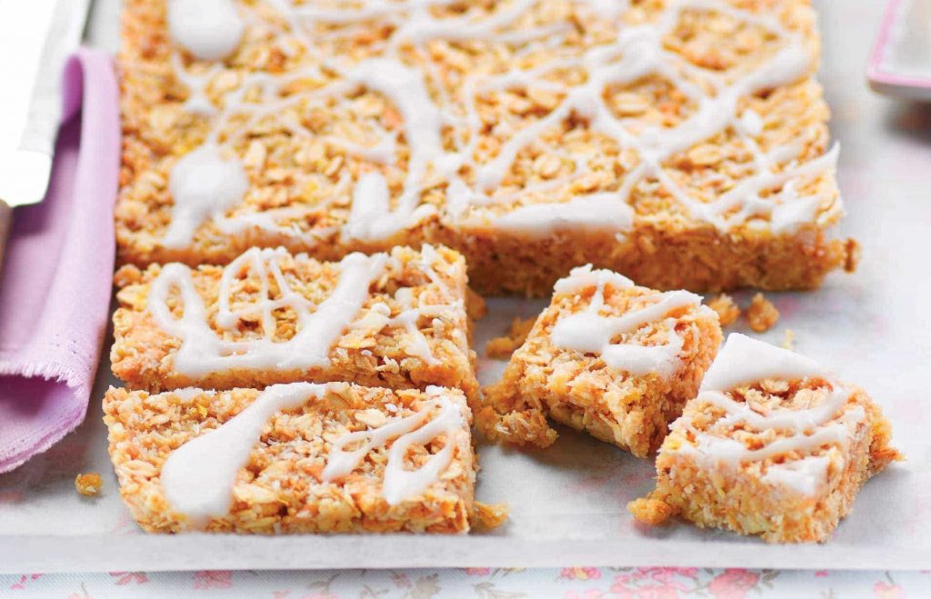 - Préparez le glaçage en mélangeant le sucre glace avec la cuillère à soupe de jus de citron. Nappez ou versez uniformément le glaçage sur la base pressée.