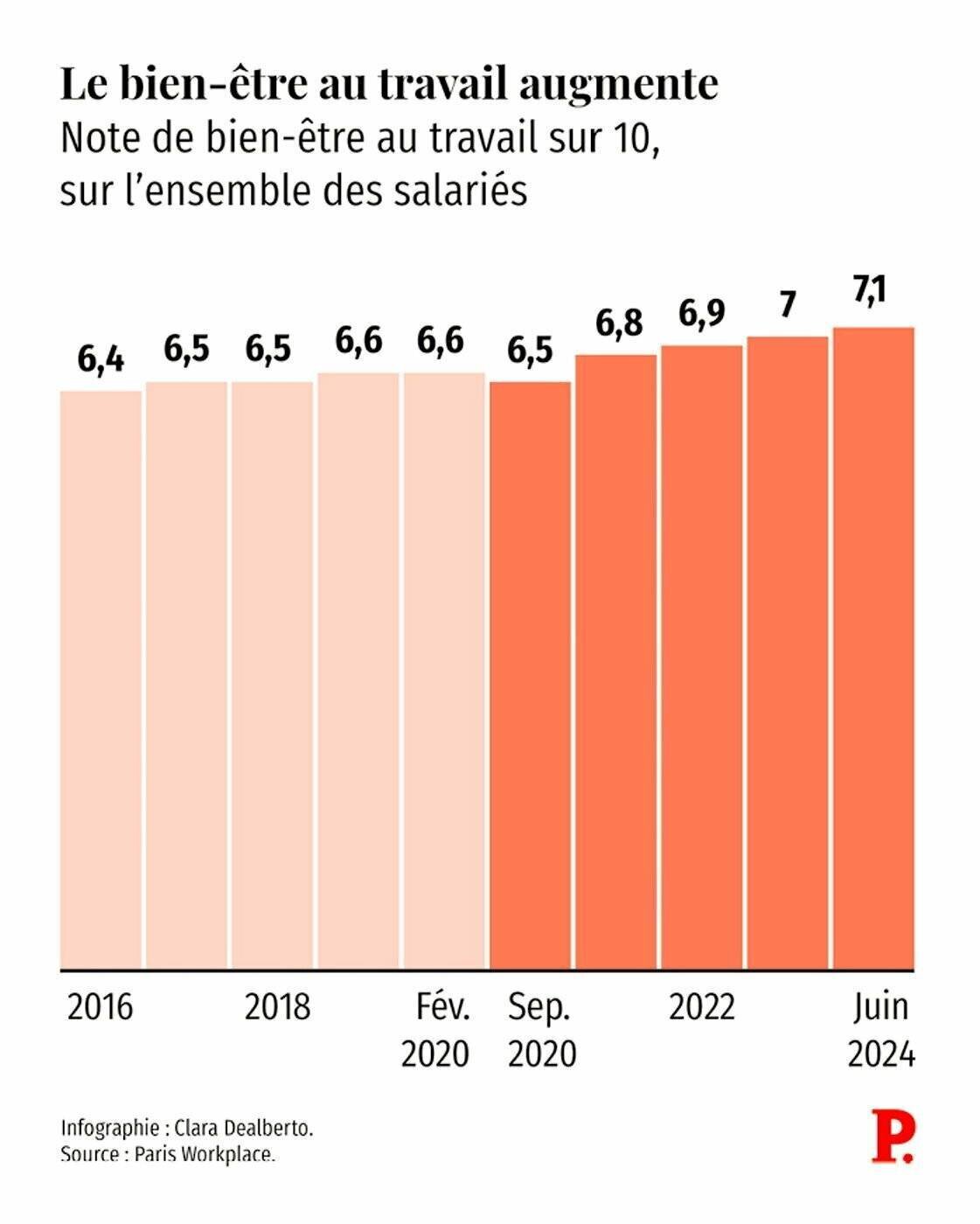 Selon Frédéric Dabi, directeur général Opinions de l’Ifop, l’appétence pour le télétravail décline depuis plusieurs années. En 2024, il atteint son score le plus bas depuis la pandémie de Covid, avec seulement 1,5 jour par semaine, comparé à 1,7 en 2023, 1,6 en 2022 et 2,3 en 2021. En parallèle, la note du bien-être au travail est à son plus haut niveau, avec 7,1 sur 10, montrant une augmentation continue depuis septembre 2020.