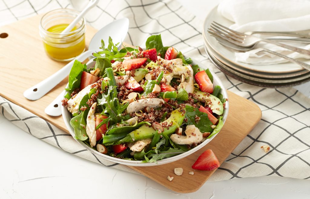 - Dans un grand bol, réunissez le quinoa, le kale, les haricots et les fraises, mélangez délicatement. Disposez sur un plat et garnissez d’avocat, de poulet et d’amandes. Nappez avec la vinaigrette et servez.