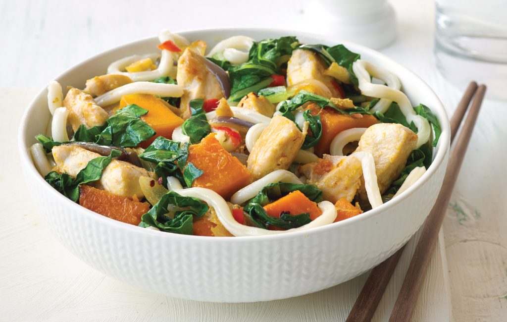 - Ajoutez le poulet et poursuivez la cuisson 3 minutes supplémentaires ou jusqu’à ce qu’il soit doré. Ajoutez le potiron avec le reste d’huile et un peu d’huile en spray si nécessaire, et laissez cuire 4–5 minutes en remuant de temps en temps. Ajoutez le bok choy et laissez cuire encore quelques minutes.