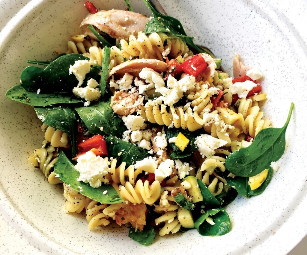 - Dans un bol, mélanger les pâtes, les légumes, les épinards, le poulet effiloché, le pesto sans fromage et la feta halal. Mélanger soigneusement.