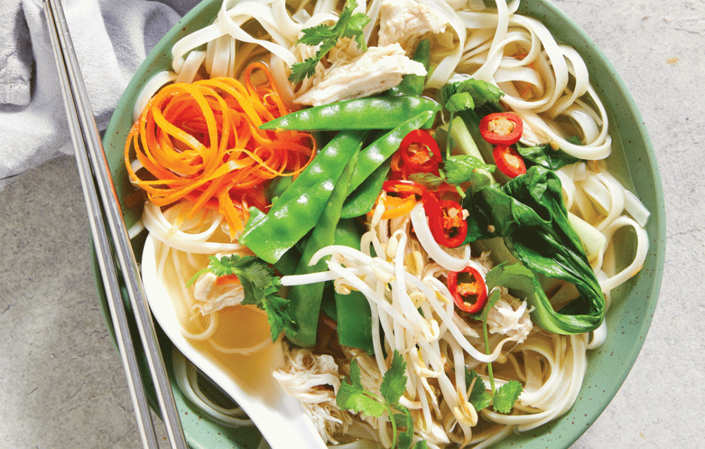 - Répartissez les nouilles et le poulet effiloché entre quatre bols de service. Versez le bouillon bien chaud et les légumes par-dessus, et garnissez de pousses de soja, de piment frais et de coriandre si vous le souhaitez.