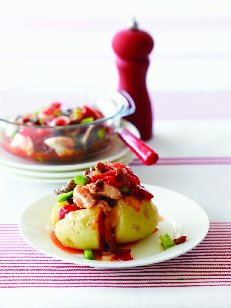4 Ajoutez la sauce chili avec le poulet et faites cuire pendant 1-1 minute et demie à puissance maximale jusqu’à ce que le plat soit chaud, en remuant à mi-cuisson. Incorporez les raisins secs (si utilisés). Servez le poulet avec les pommes de terre en robe des champs.