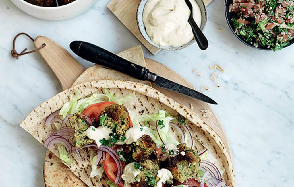 - Pour servir, garnissez chaque tortilla ou pita de 3 falafels (ou coupez-les en deux si vous préférez), puis ajoutez la laitue, les tomates, l’oignon rouge et le taboulé. Nappez de houmous détendu et, si vous le souhaitez, arrosez d’une touche de sauce pimentée. Servez le reste du houmous, du taboulé et des falafels à part.