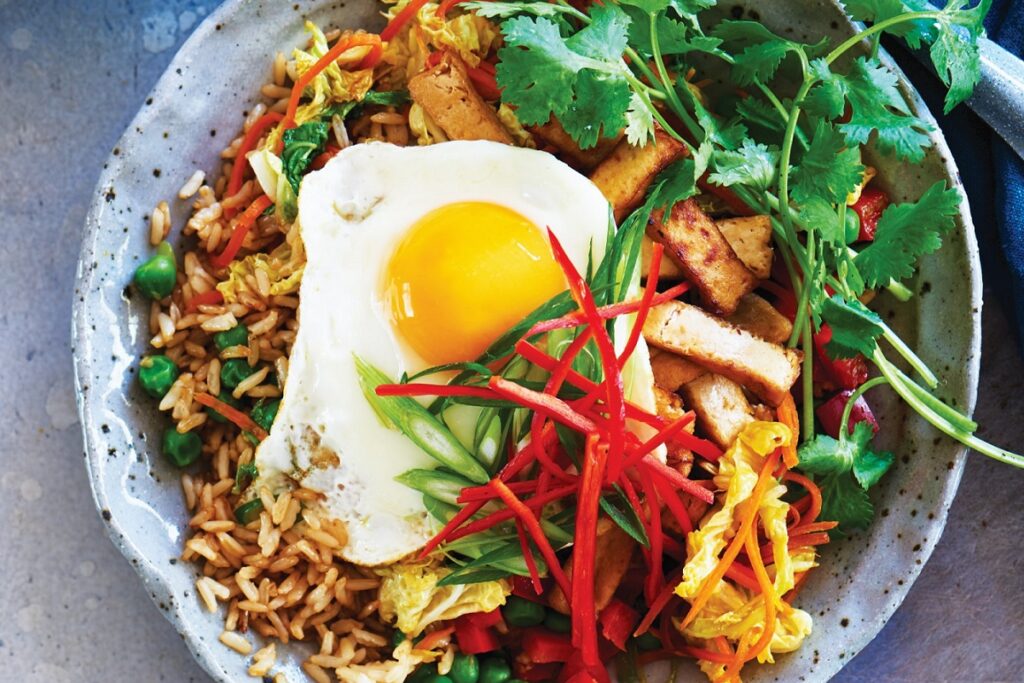 4 Répartir le riz frit dans quatre bols de service. Servir le riz garni d’un œuf frit, d’échalotes supplémentaires, de piment tranché et de feuilles de coriandre.