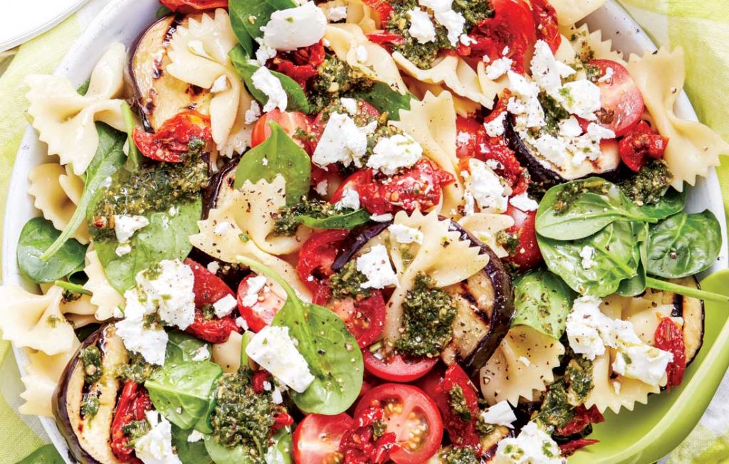 - Ajoutez les aubergines, les deux types de tomates et les feuilles d’épinards. Saupoudrez de feta et servez.