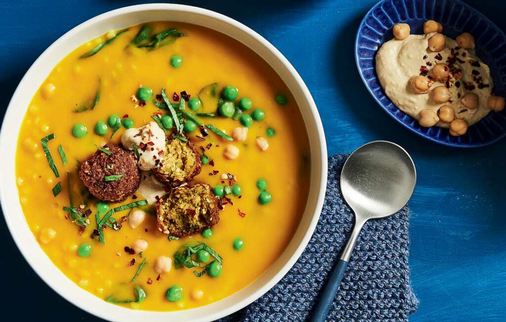 Transformez une simple soupe de citrouille en un festin moyen-oriental grâce à l’ajout de falafels, de pois chiches, de houmous et de couscous perlé ! Cette recette peut également être végétalienne !