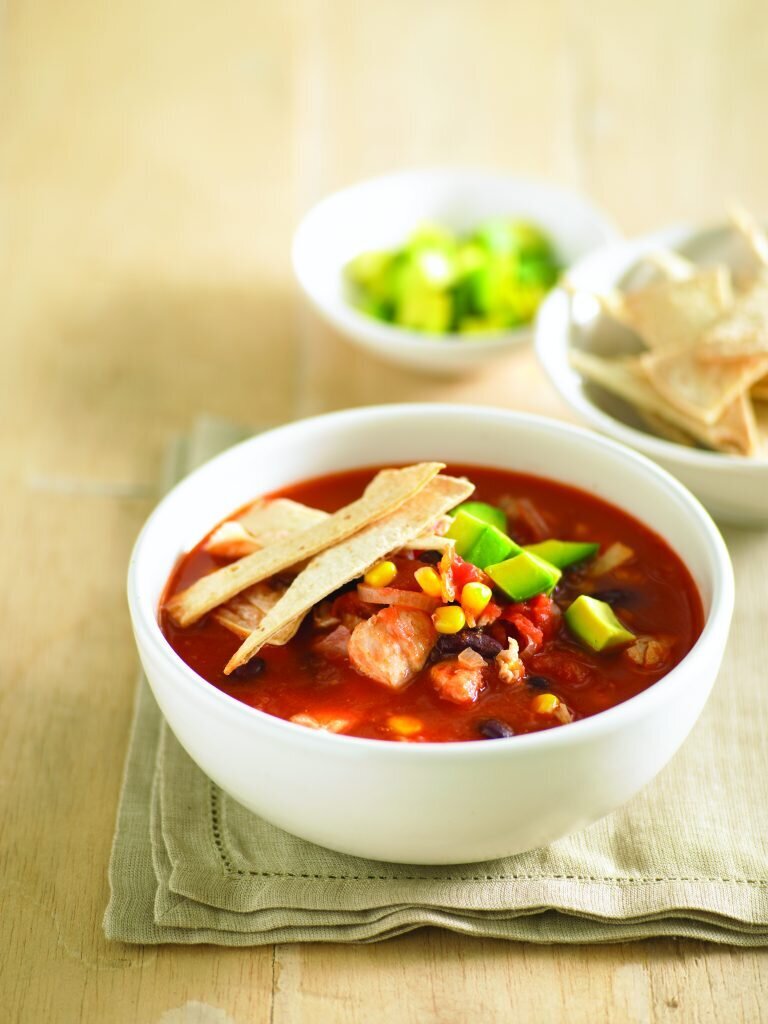 - Répartissez la soupe dans des bols. Garnissez de chips de tortilla croustillantes et des dés d’avocat avant de servir.