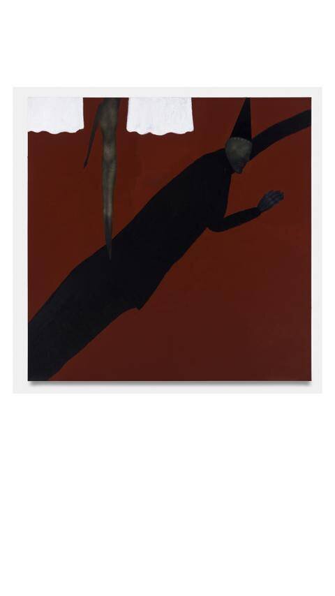 “The Loud Dust Under the Sofa”, 2025, acrylique, peinture à base d’alcool et pastel à l’huile sur toile, 230 x 230 cm.