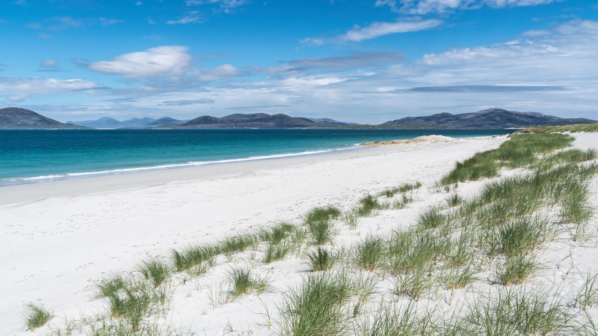 Le sable blanc de cette plage est composé de fragments de coquillages broyés au fil du temps, tandis que le machair – une prairie basse et herbeuse typique des Hébrides – longe la plage et offre un cadre idéal pour la promenade.